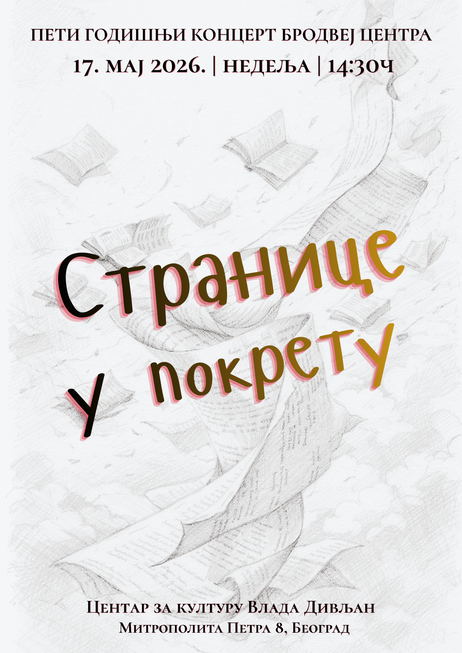 Plesni koncert Brodvej centra sa edukativnom predstavom „Stranice u pokretu” biće održan u nedelju, 17. maja 2026. godine u 14:30 časova.
