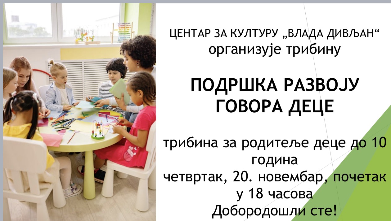 Podrška razvoja govora dece Dešavanja, Izdvajamo, Slajder_home Posted on 3 дана ago by admin Centar za kulturu „Vlada Divljan“ organizuje tribinu za roditelje dece do 10 godina u četvrtak 20.novembra sa početkom u 18 časova Share: