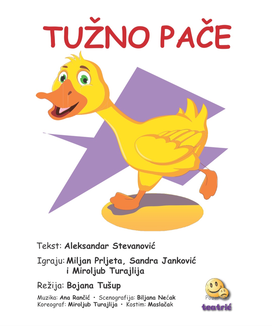 Predstava Tužno pače je realizovana u saradnji sa Sekretarijatom za kulturu grada Beograda. Priča u sebi nosi veoma važne poruke o toleranciji, drugarstvu i odrastanju. Malo pače, Paja, ima najboljeg druga, petlića Peleta. Oni sanjaju o avanturama, prave splav, pomažu jedan drugom oko školskih zadataka i spremaju se za muzičko takmičenje. Ali njihovo prijateljstvo zamalo da upropasti tetka patka koja se lažno pretstavlja kao labud i ne želi da se Paja druži sa živinom. Dolazi Deda Patak sa sela da otkrije neke porodične tajne i urazumi tetku. Posle niza drmatičnih situacija svaki od junaka naše priče shvata da je poseban, jedinstven i važan, baš takav kakav je.
