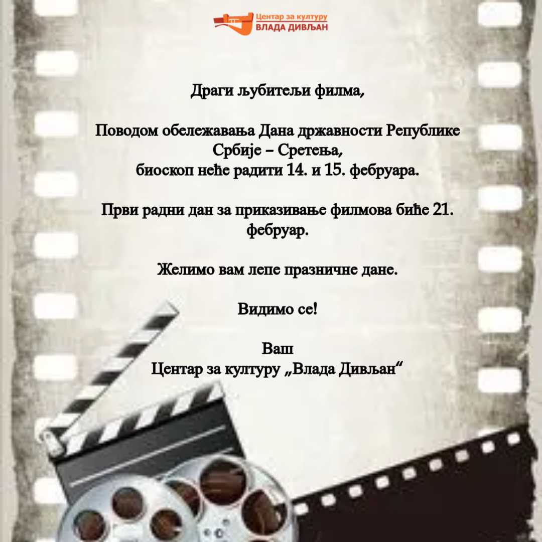 Radno vreme bioskopa za praznike Dešavanja, Izdvajamo, Slajder_home Posted on 3 сата ago by admin Dragi ljubitelji filma, povodom obeležavanja Dana državnosti Republike Srbije – Sretenja, bioskop neće raditi 14 i 15 februara. Prvi radni dan za prikazivanje filmova biće 21. 02.2026 Share: